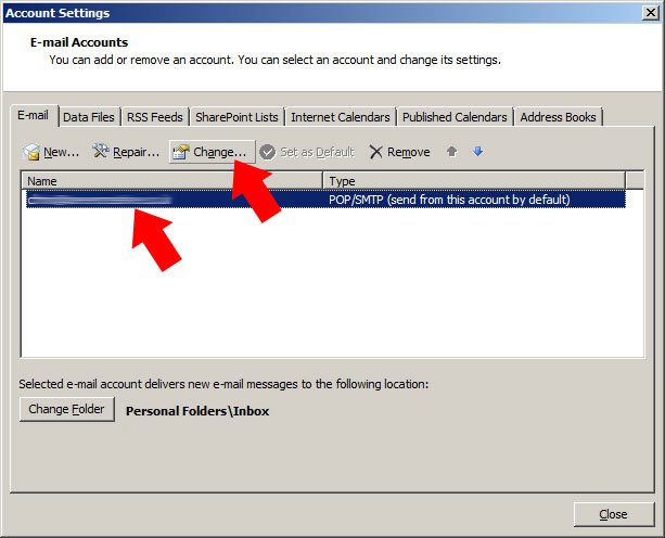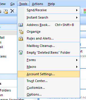 Open Outlook and select ‘tools’ (from the top menu) then select ‘account settings’