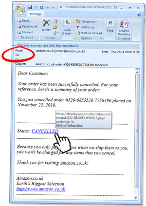 Secondly, it’s perfectly within the realms of possibilities that an order may have been cancelled –cards get stopped, vendors run out of stock… there are numerous reasons for this so you’d have no reason to, on first glance, assume that the email was legitimate.