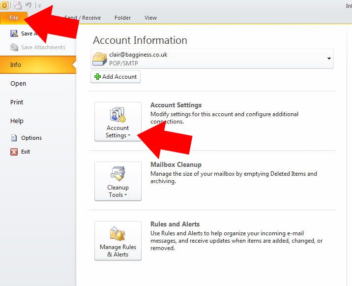Open Outlook 2010, click ‘file’ option at the top of the screen, then click on ‘account settings’